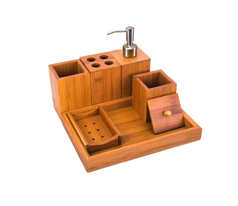 | BW8007 | Size:Soap/Lotion Pump Dispenser: 2.9*2.9*7, Cotton Ball/Q-Tip Box w/ Lid: 2.9*2.9*4.3, Toothbrush Holder: 2.9*2.9*4.7, Toothpaste box: 2.9*2.9*4.5, Soap Box: 4.7*3.1*1, Tray: 10*7*1.1inch | Bamboo/Wood | 1,Lead time for samples:Ready in 7 -10 calendar days |
